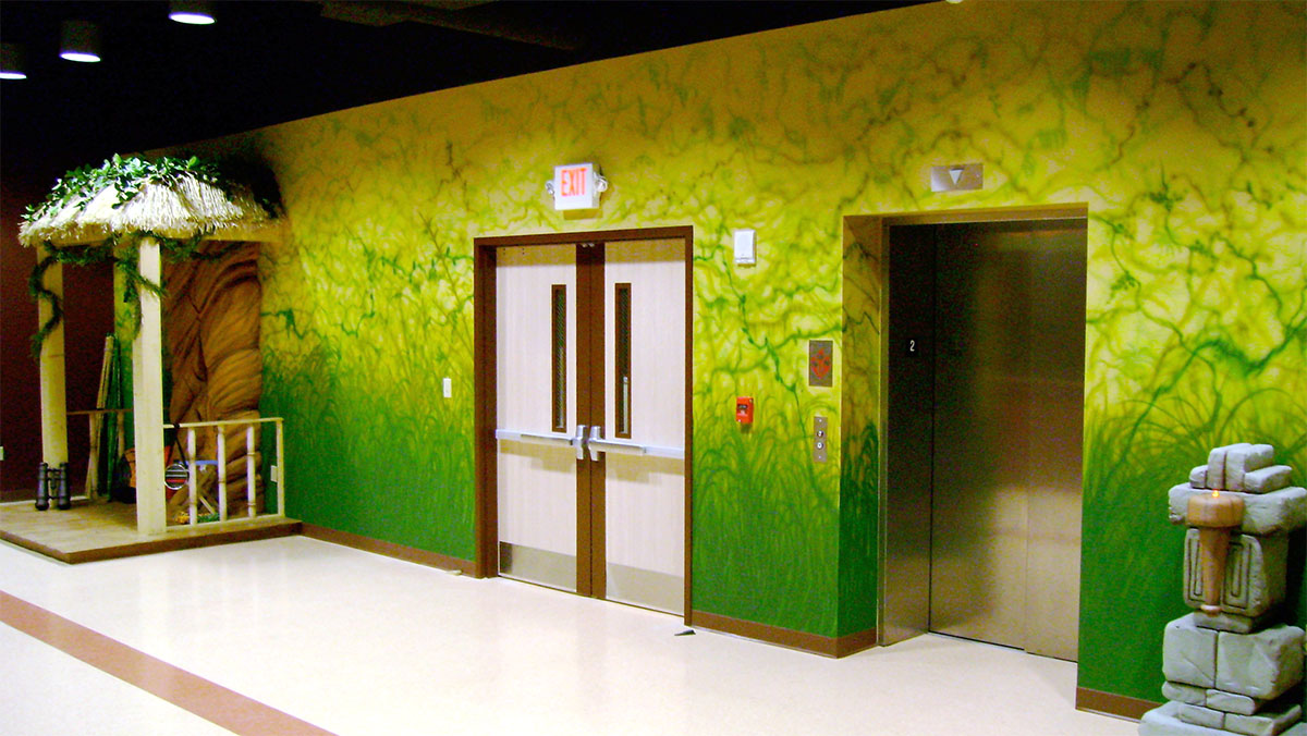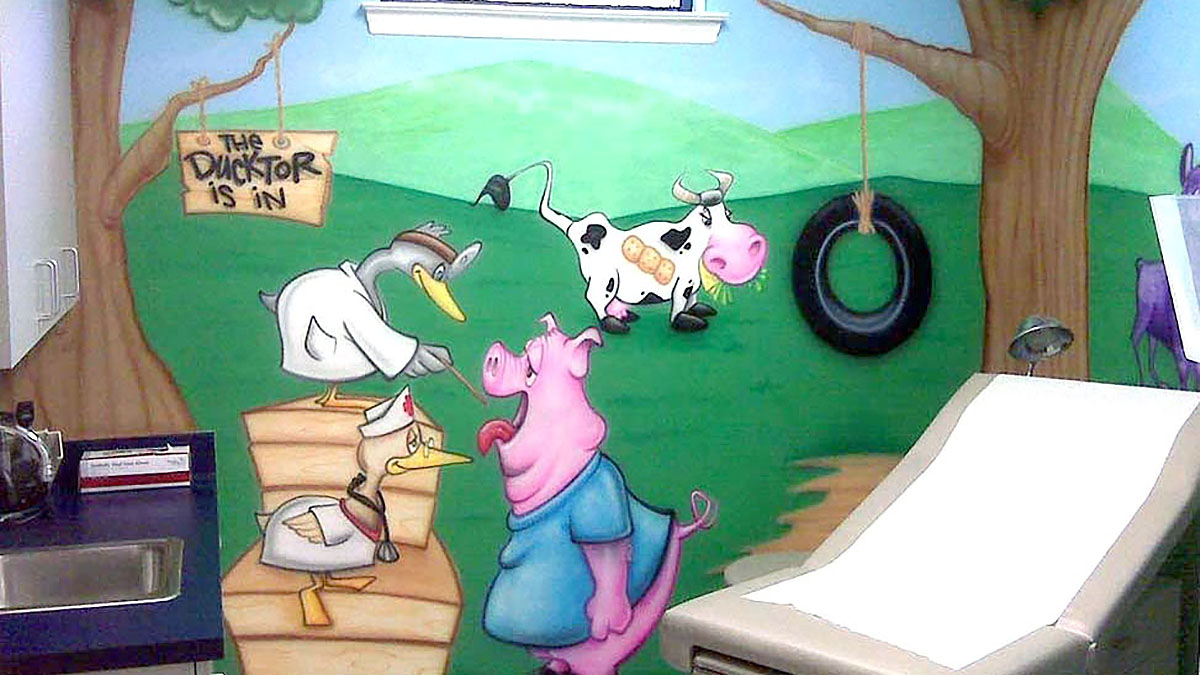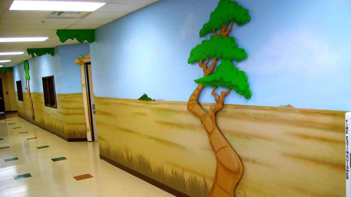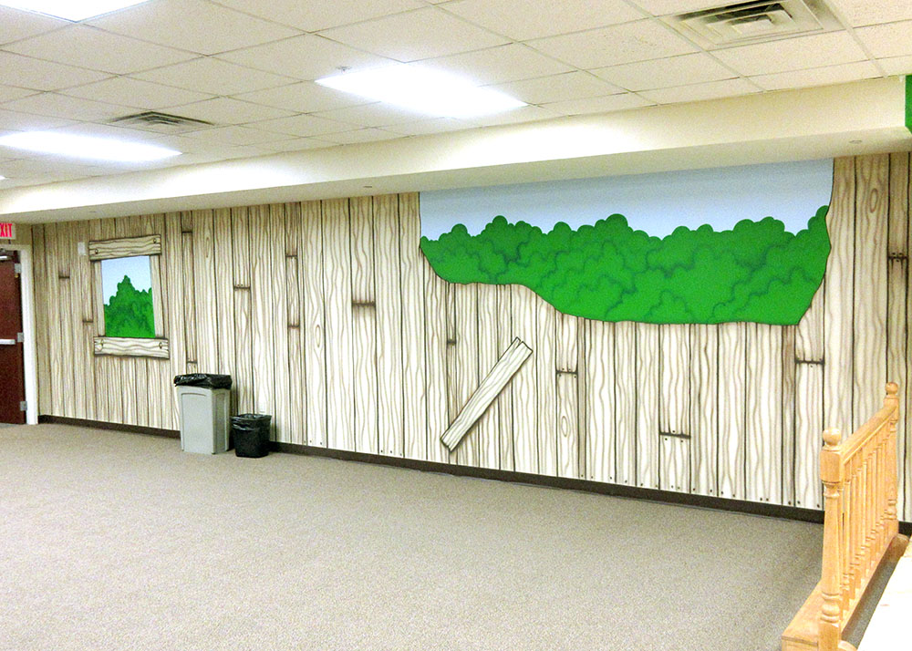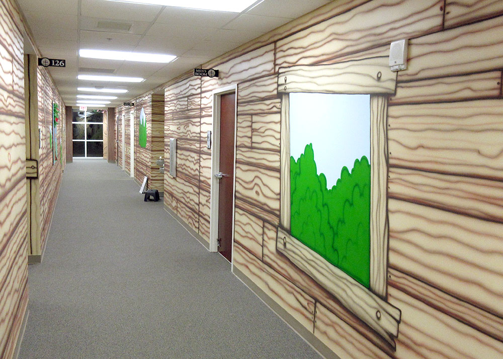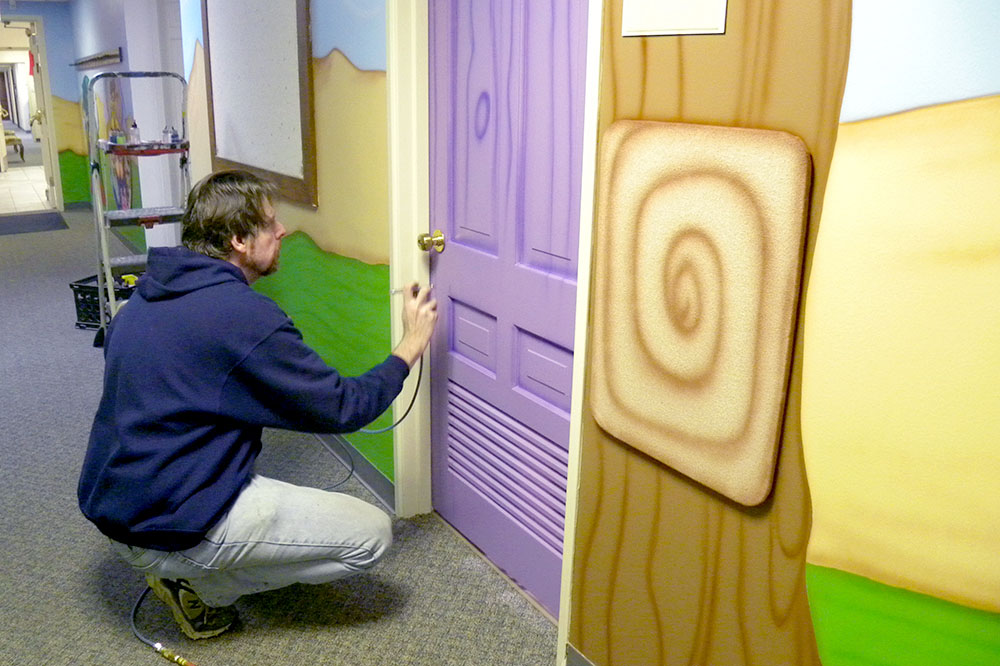 Creating a cartoon woodgrain wall mural treatment for a pediatric office.